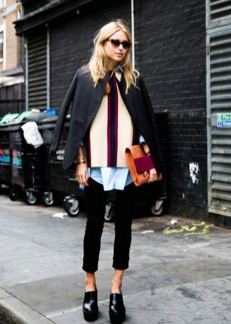 It is better to avoid in combination with lacquered shoes of shiny fabrics and accessories, excessive decor and extravagant things.