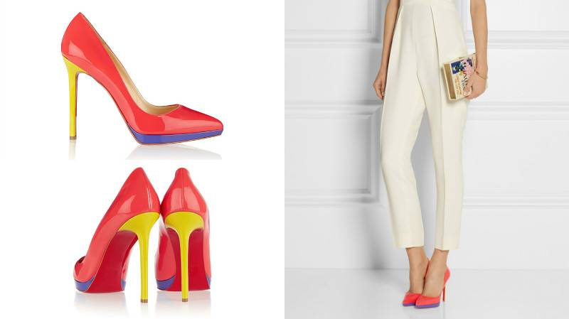 - Bright and stylish patent leather shoes will appeal to lovers of the original and the new. Shoes on the platform with a stud are made in an interesting three-color design: heel-yellow, the top of the shoe (shoe) is brightly crimson, the platform is highlighted in purple. These shoes are suitable for casual style in combination with monochrome outfit - white, gray, black.