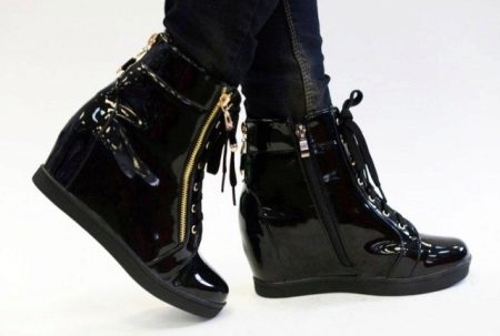 Patent leather wedges and platform shoes also in high demand. Such models can be closed, with an open toe, with an ankle strap, with a jumper and a buckle, ties.
