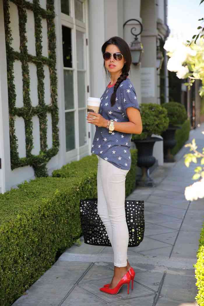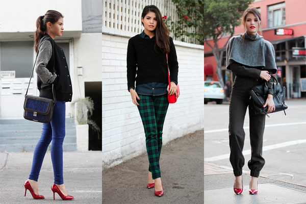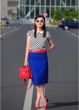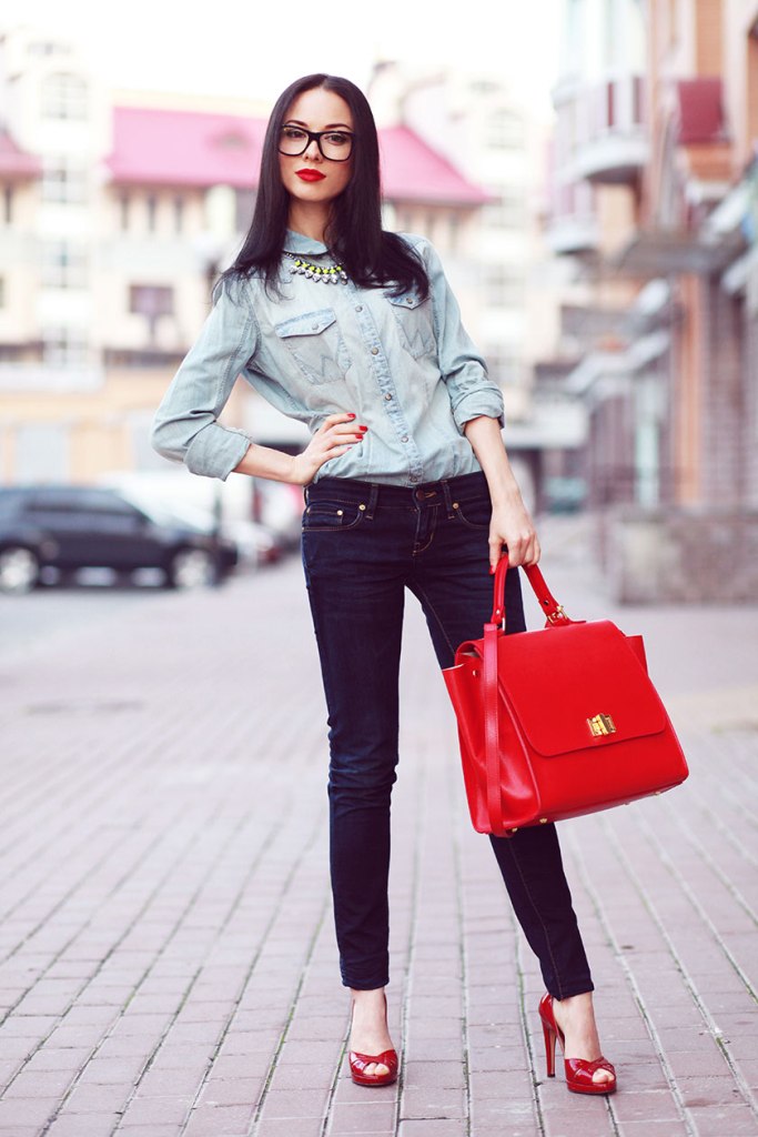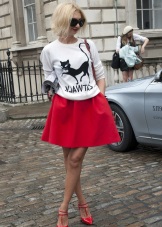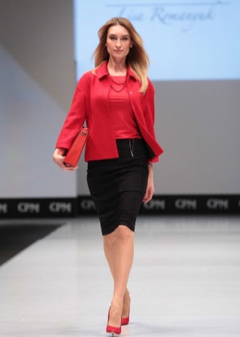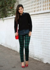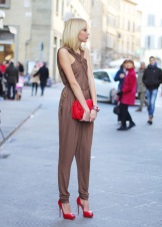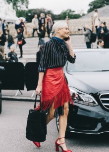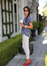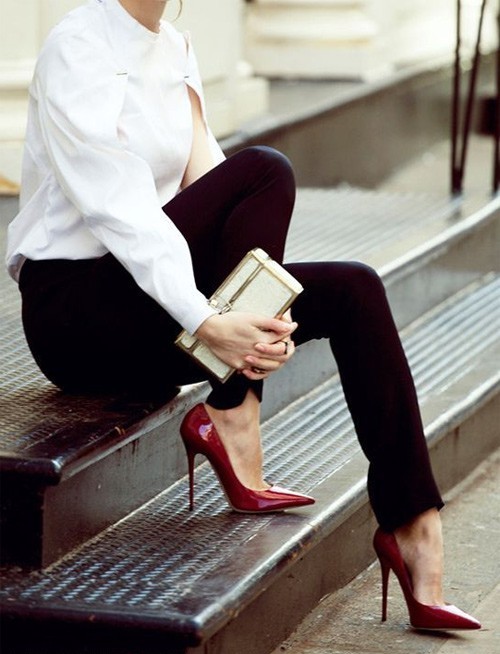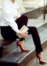 Any business woman will be able to emphasize their status with spectacular red pumps. In this case, stylists are advised to pay attention to the shoes of darker red shades - wine or scarlet. This accessory will most effectively complement the bow, which consists of classic narrow trousers and a light shirt or blouse in a small pattern.
