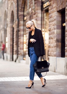 The ideal option here would be black patent leather pumps with low or high heels. Such footwear plays a leading role in a suit, it is not necessary to abuse details. Best of all such shoes fit a strict gray suit with a skirt or pants and a strict bag.