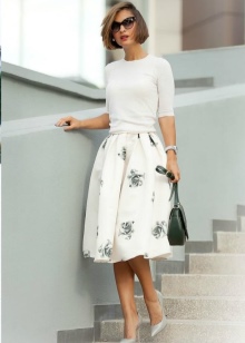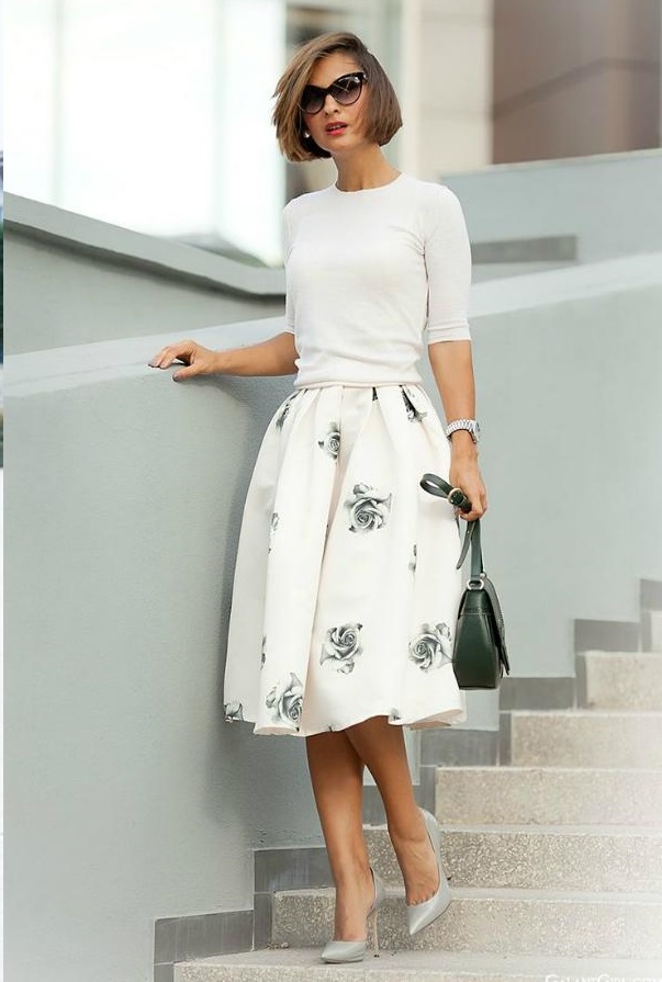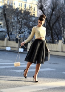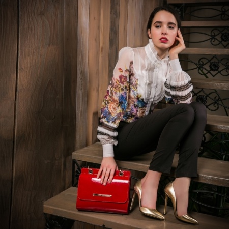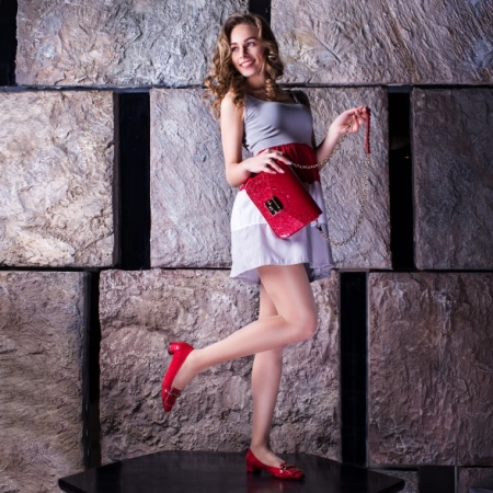 Black, red and white varnish shoes are perfect for this look. Other local colors will look good in the image. The combination with lush skirts and a simple ornament (strip, peas) will be perfect. You can complement the outfit with a small lacquer handbag and narrow strap. Low-heeled pumps, popularized at one time by the incomparable Audrey Hepburn, will fit perfectly into this look.