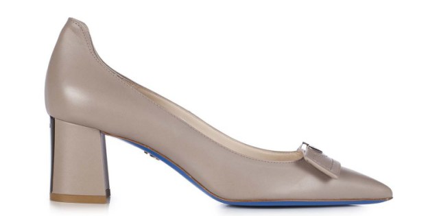 Not less elegant look closed shoes on a wide, steady heel of beige color with a minimum of decor in the form of a bow on a narrow toe with gold trim.
