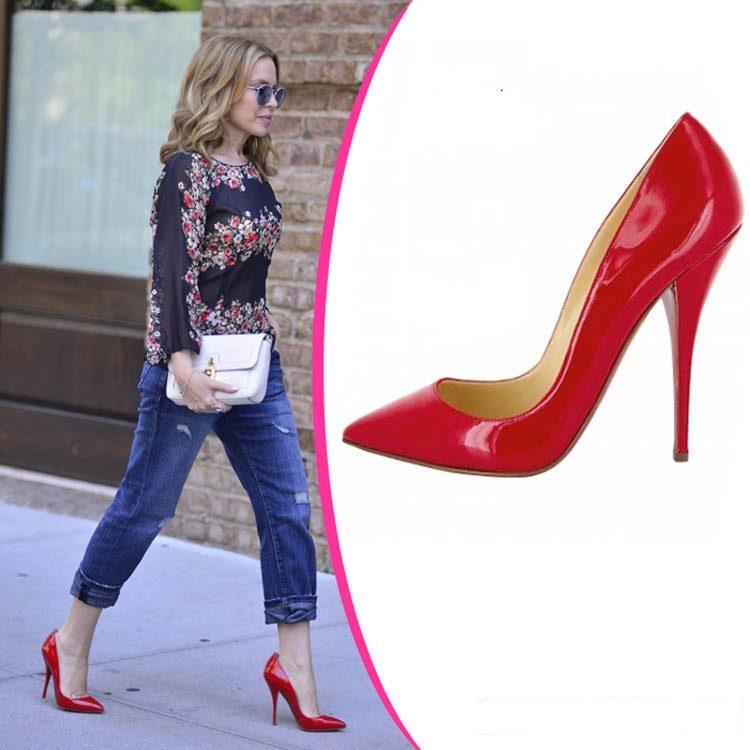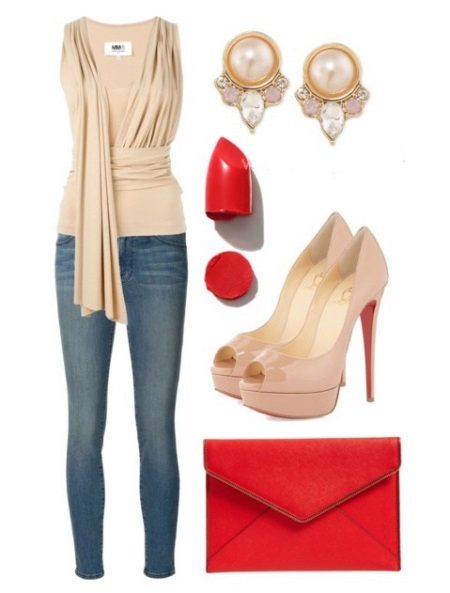 The already classic red laputenes will always be combined with any monophonic outfits. It is best to not mix more than 2-3 colors in this image.