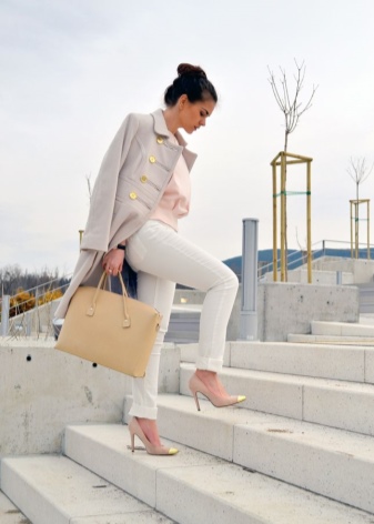 Cream shoes with black and white clothes are a win-win option. Next to milk-colored shoes, white things will seem even brighter. Black things in combination with milk lacquer shoes interestingly place accents in your image, as well as highlight the advantages of your figure.