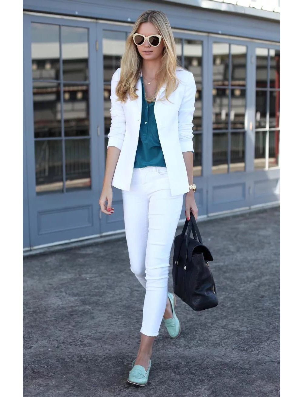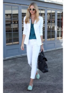 Peppermint shoes with a combination with jeans, boyfriends and elegant white blouse look very nice. The fitted jacket will emphasize the elegance of the figure. Clutch and costume jewelry will be a luxurious completion of everyday look.