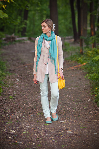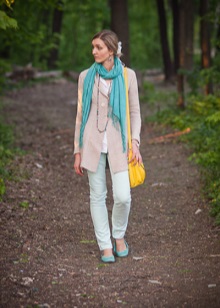 Beautifully looked mint shoes with beige trousers. A t-shirt with a print in the tone of the shoe and a spectacular scarf will add a brightness to the bow. Without a contrasting green handbag, the image would not be complete.