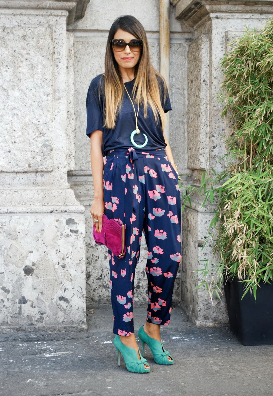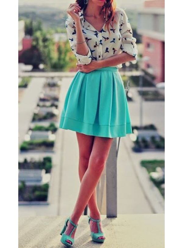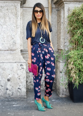 No need to exclude from your wardrobe mint shoes and girls with non-standard figure. The long blouse of a nice floral print looks great with capri pants and mint shoes.