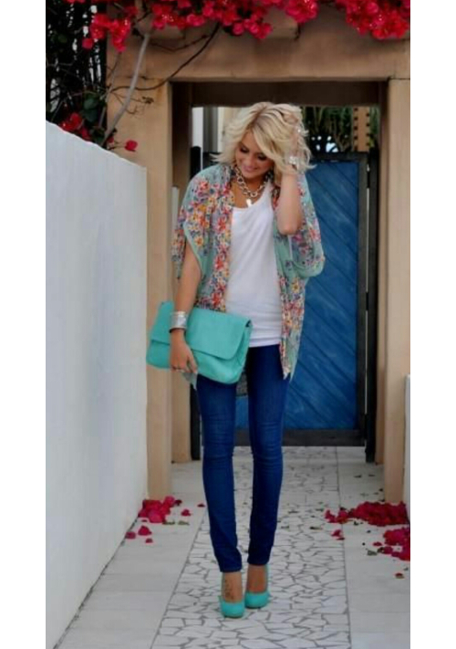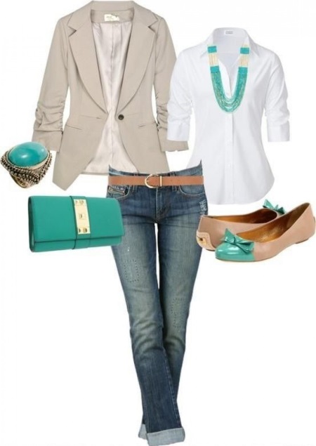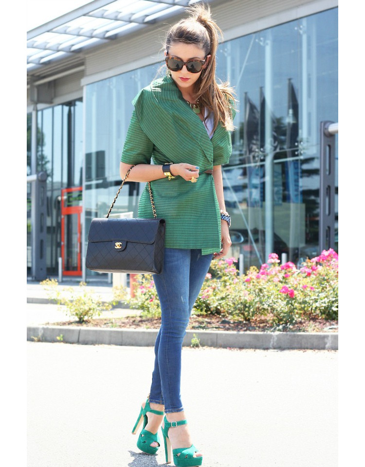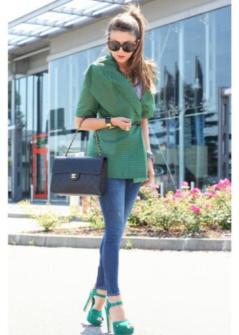 Looks stylish green jacket in tandem with narrow jeans and mint shoes. The final element of an attractive image will be a small black handbag.