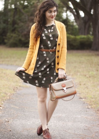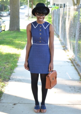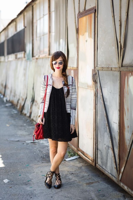 - Lace-up flats will look great with a trapezoid lace dress in tone. Complement the look with a light blazer in ethno style and aviator glasses. A bright accent of the image will be a red handbag-bag and scarlet lipstick on the lips.