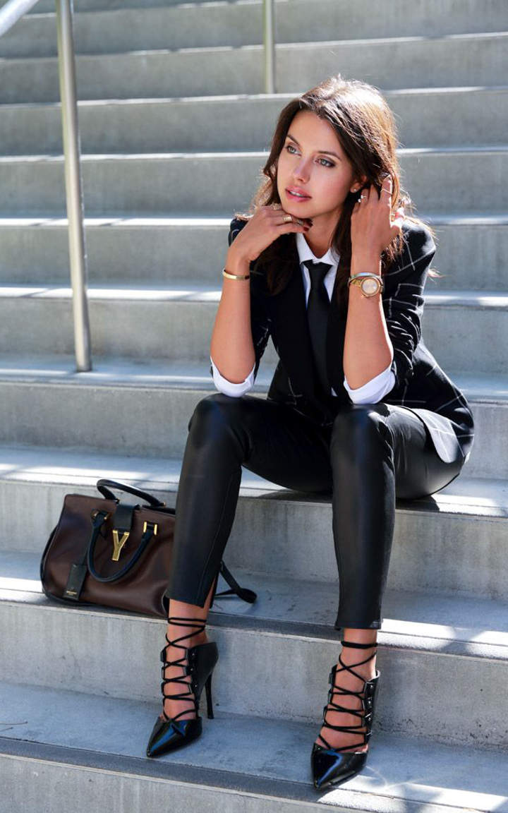 - Wear pointed shoes with a white shirt, asymmetrical midi skirt and a dark blue striped jacket to work. Black sunglasses and a stylish handbag will complement the look. Perfect outfit for creative businesswomen who are self-confident.