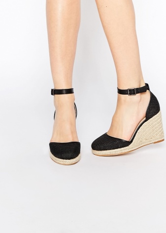 What about black wedge shoes? This is a classic that goes with everyone. Girls usually choose lacquered black wedges.Textile black wedges are suitable for women of any age.