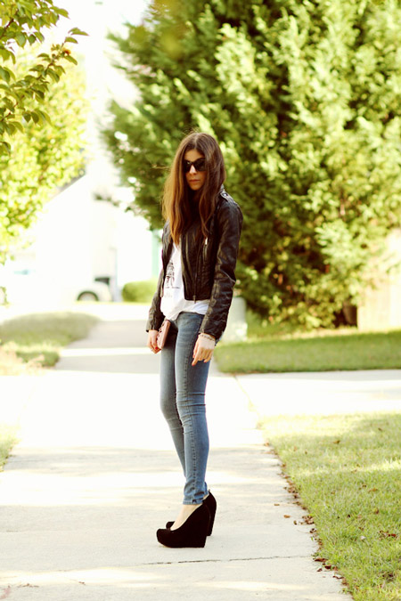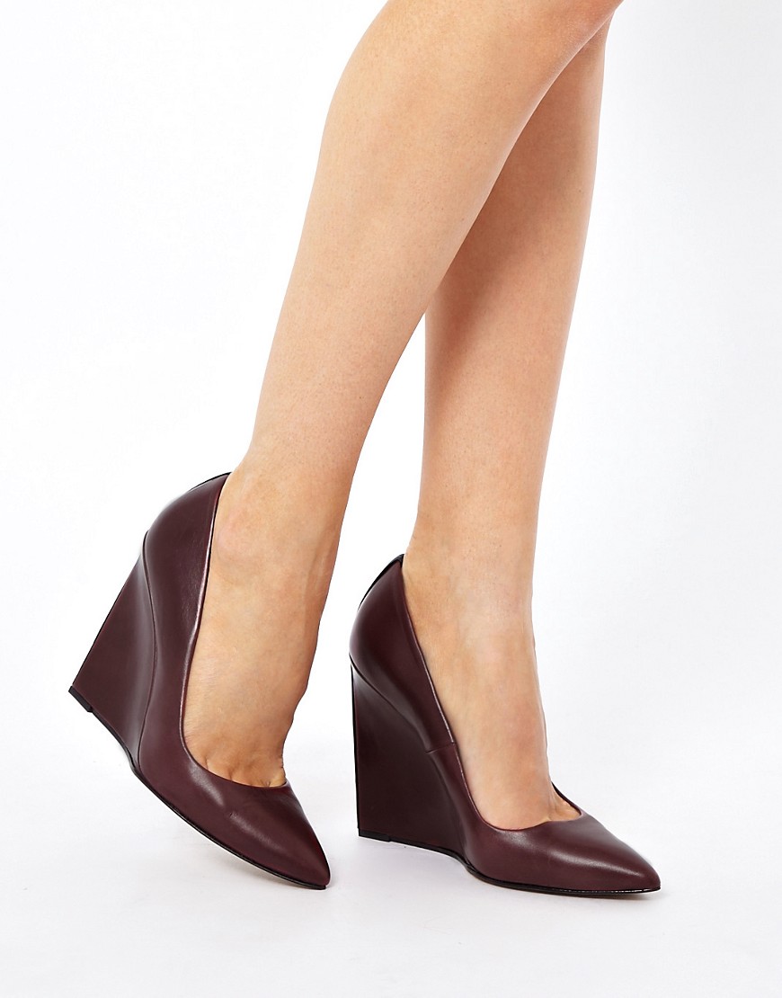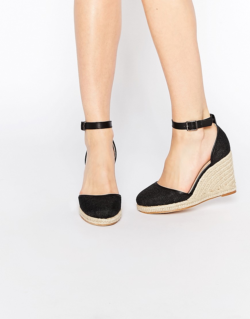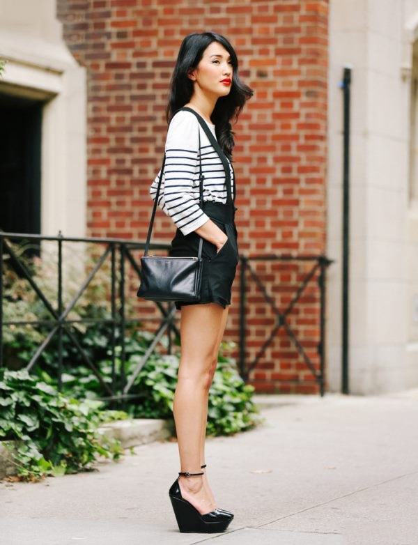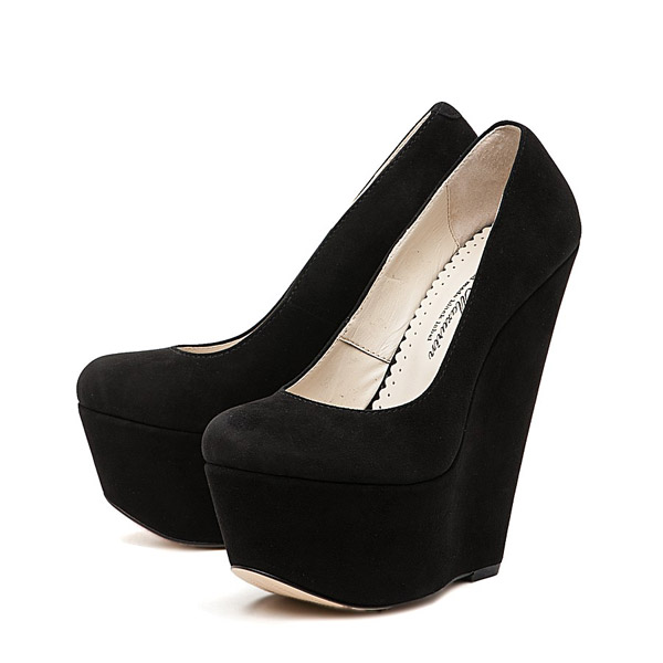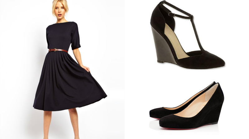 Black wedge shoes with a closed nose combined with any clothing. These can be calm-tone trousers, puffy skirts, white, black, pink and red dresses. Closed black wedge shoes do not fit to tight tight skirts and dresses.