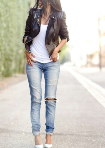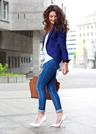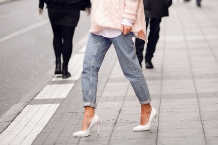 In addition, white shoes are in harmony with good old jeans. Jeans can have a classic color (blue, blue), and have more original shades (burgundy, indigo, dark green, pink).