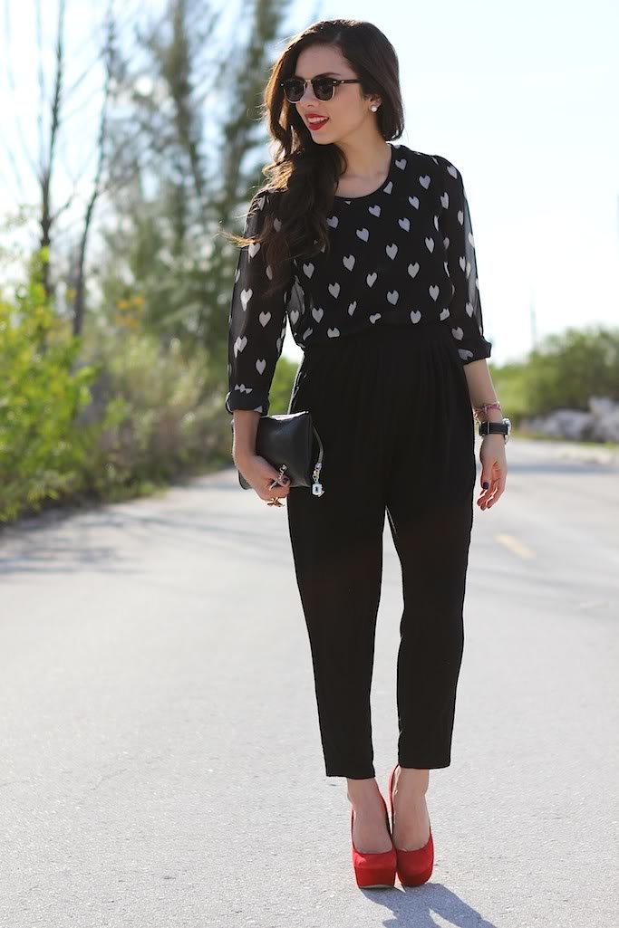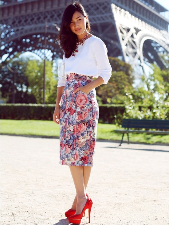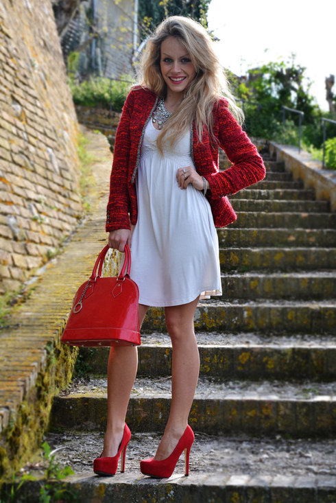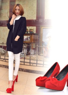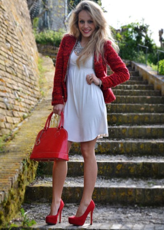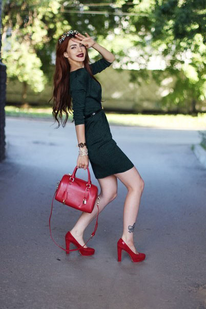 Basic colors such as white, black and blue will be an excellent complement to red shoes. The ensemble of red shoes and green dress will look bright and juicy.