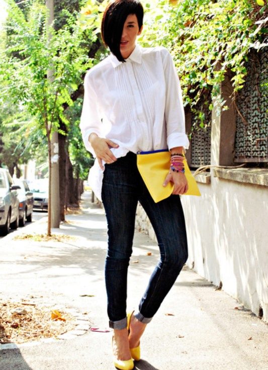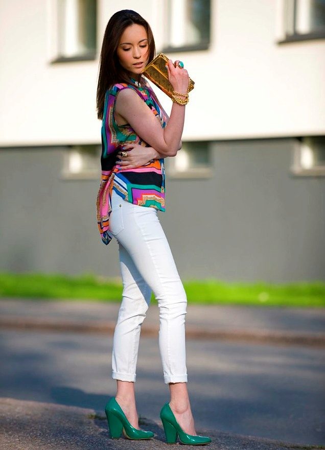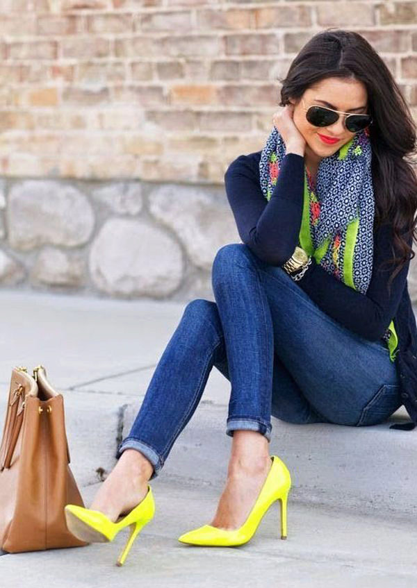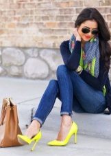 Bright pumps can be worn with tight pants, jeans, a stylish pantsuit or a pencil skirt. Of course, this does not apply to those who have a tight dress code at work.
