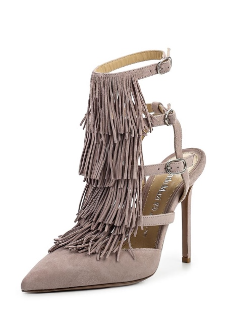 Boats with an open heel are often decorated with a fringe of the base material. Particularly elegant look high sandals with several rows of straps. The fringe, located on each strap in the front, makes the model exquisite. An open heel provides extra air to the legs. Such "companions" are perfectly combined with light dresses and sundresses of any length.