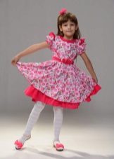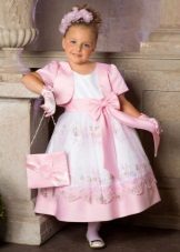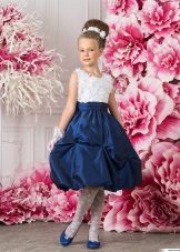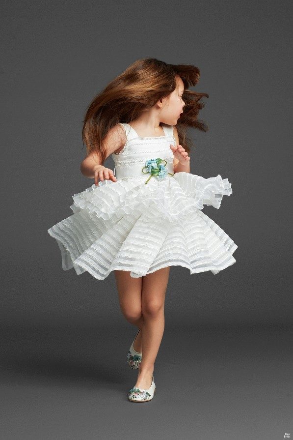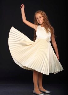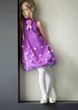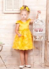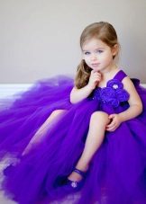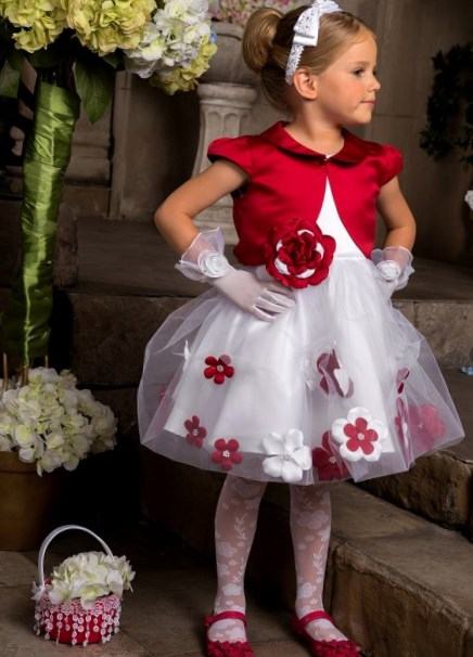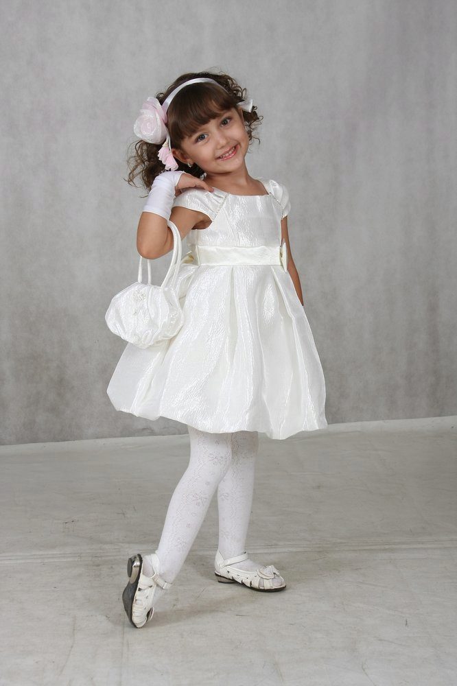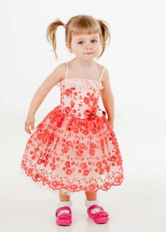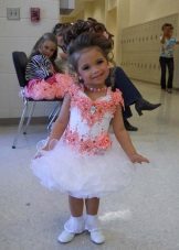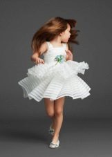 An excellent example of a bright image that can be used for any celebration. For such a bright dress does not need expressive and flashy shoes, so concise white shoes with unpretentious decor were chosen. Pay attention to the heel: it is small and steady - just what a little princess needs. These shoes in the future can be used in everyday life.