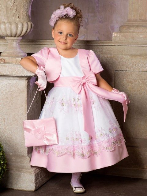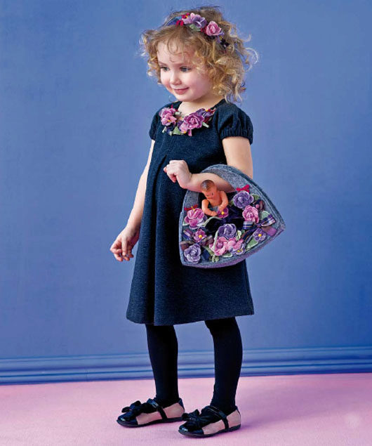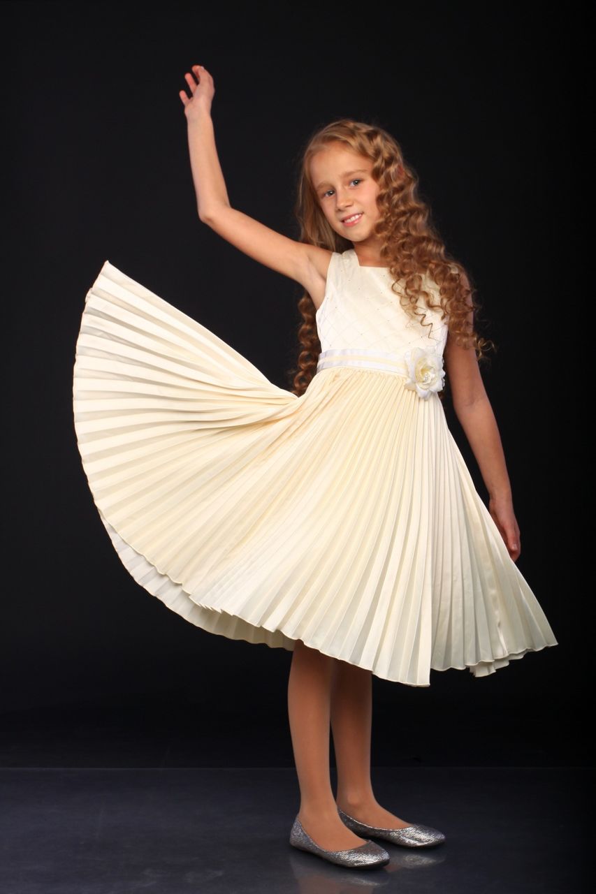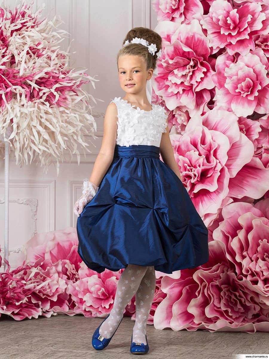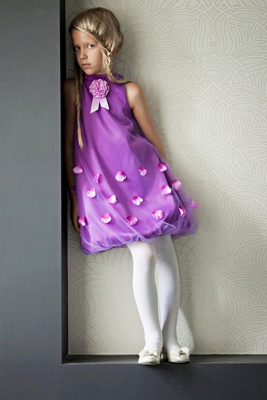 The image of a little lady appears before us: concise, discreet, elegant. There is nothing superfluous and missing. Even golden shoes perfectly fit this look. They echo the golden embroidery that adorns the top of the dress. The image of a little lady always looks advantageous and festive.