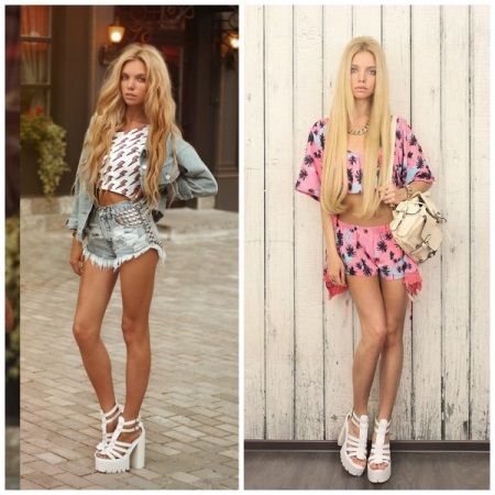 Open shoes on tractor soles fit almost all summer outfits. Denim sets, airy dresses and skirts, as well as short shorts and tight-fitting leggings harmonize with unusual shoes.