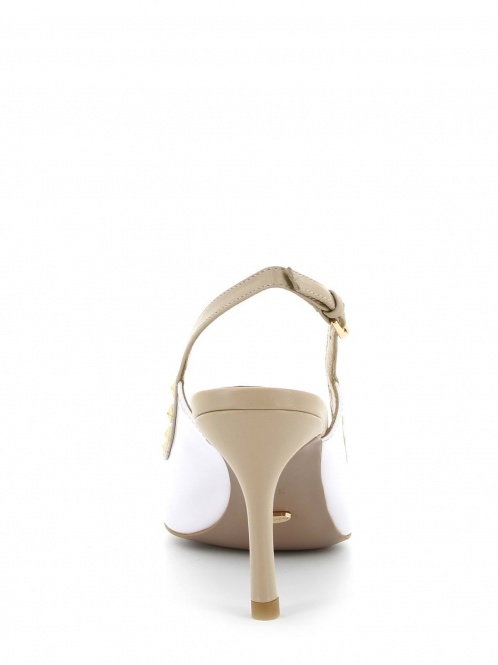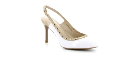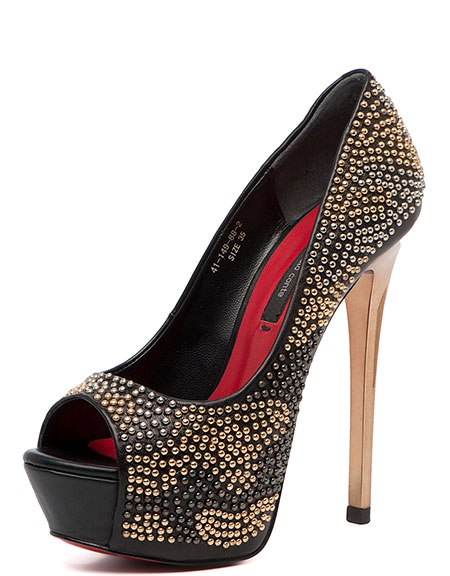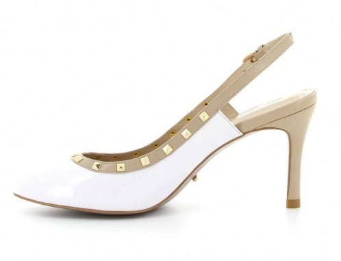 A rounded toe in combination with a 7-centimeter heel makes this shoe model as feminine as possible, and decorative miniature spikes attached around the perimeter of the beige rim of the product add some charm to it. The open heel and thin strap perfectly emphasize the sophistication of female legs.