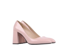 Delicate polished leather Prada pumps with coarse square heels look rather unusual. Monochromatic models with a pointed toe are the ideal solution for strictly office attire. Boats on a square heel look original and at the same time very solid.