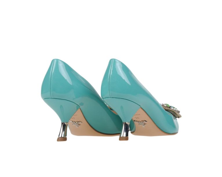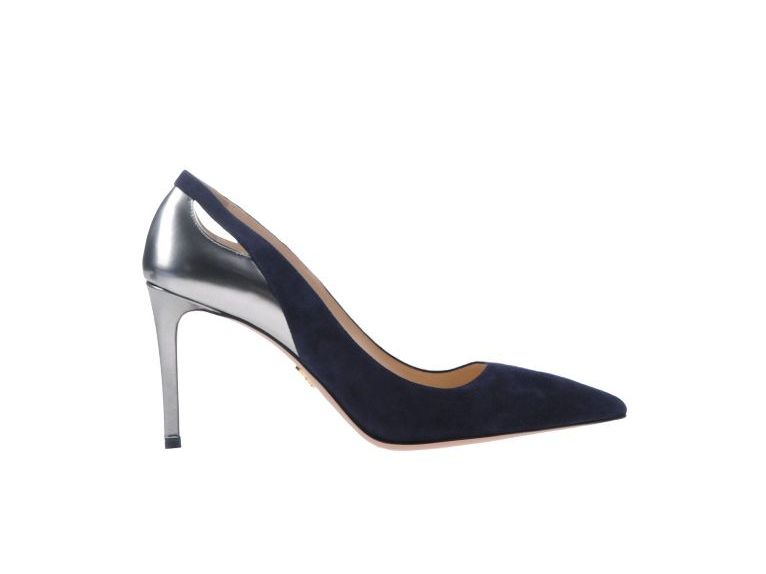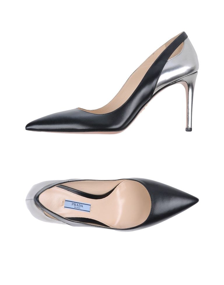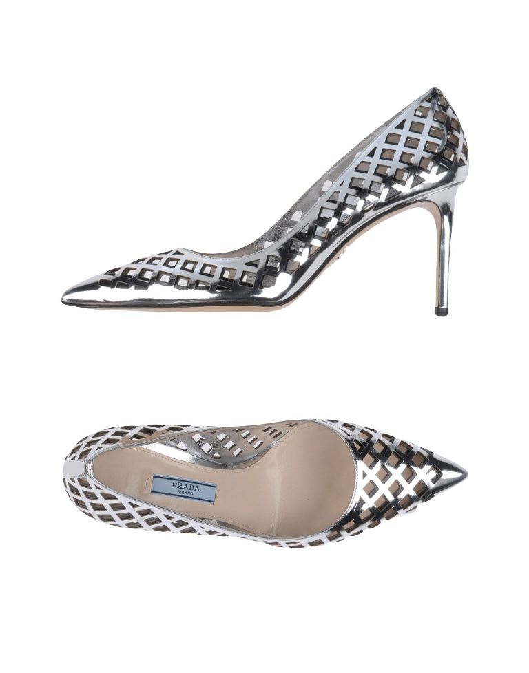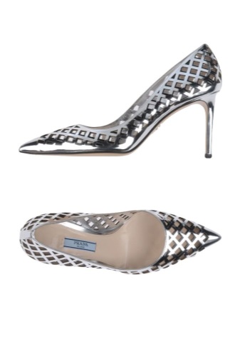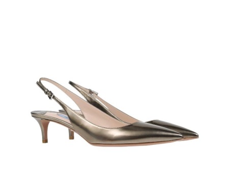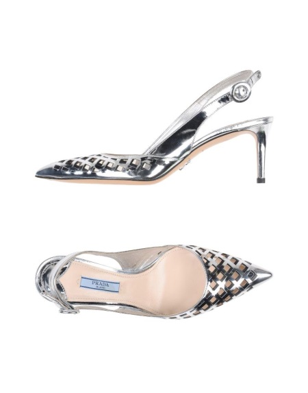 Pointed Prada shoes with a metallic heel look very sexy and feminine. The backdrop of these models is painted in silver (metallic) color.