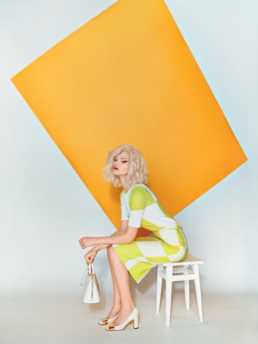 The brilliant laminated pumps with an open heel in combination with the fitting light dress, which matches the tone, look very elegant and romantic.