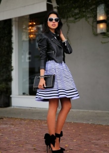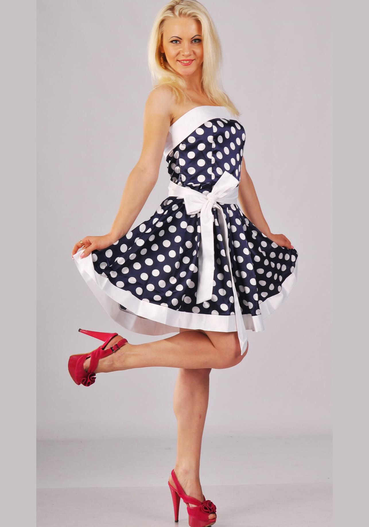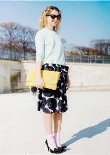 - dresses in pin-up style with wide skirts and geometric prints with plain contrasting shoes with a bow on the toe;