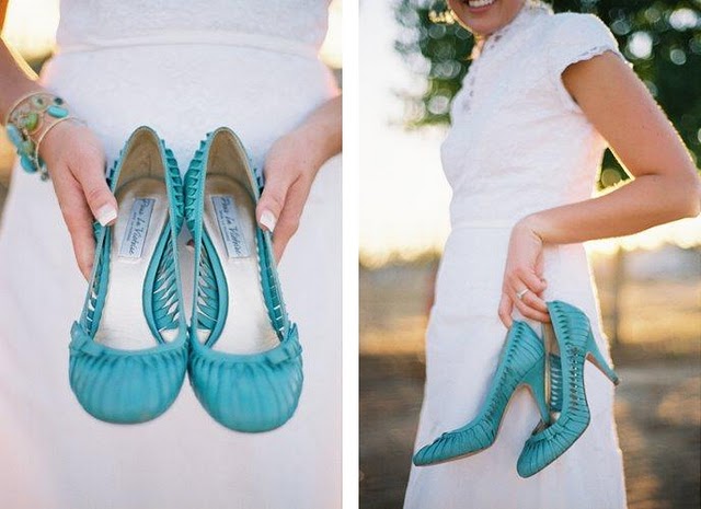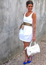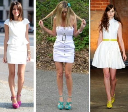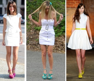 The whiter the white color, the better it looks with bright colors of shoes. Blue shoes and white dress evoke a nautical theme. Bright shoes become the accent in the image, they can pick up bracelets and chains in color, bags, clutches, scarves around the neck or wrist, hats. Purple shoes in combination with a scarf in your hair or a rim will add luxury. But the green shoes will refresh the image. Yellow will add warmth and radiance.