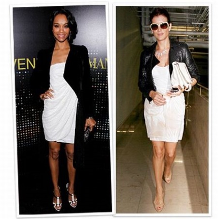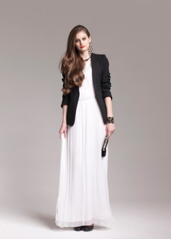 - The black. Classic. These two colors are always compatible with each other. This range is suitable for the office, and in the evening it is safe to make a party outfit. By adding pendants with black stones, a bolero or a jacket to it, you will make the image universal. Black shoes, of course, create a decent pair of white dress.