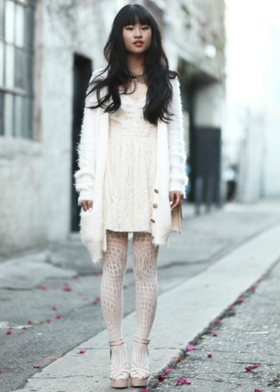 Black tights are a classic version. The denser the fabric of the dress, the denser the tights. If this is an office style, then tights should be transparent, so as not to look rude and not create dissonance with a white dress.