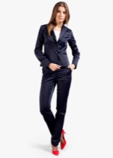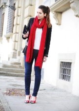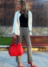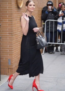 - Clothes made of monochromatic fabrics of blue, gray, white colors, as well as a fabric with a light dark stripes - this is the perfect combination with red shoes.