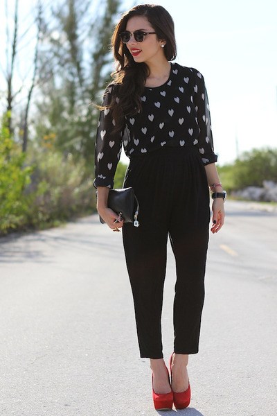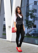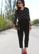 - It goes well with red shoes with short black trousers of any cut and a spacious white blouse. Also, black or dark gray breeches are perfect for combination with red shoes.