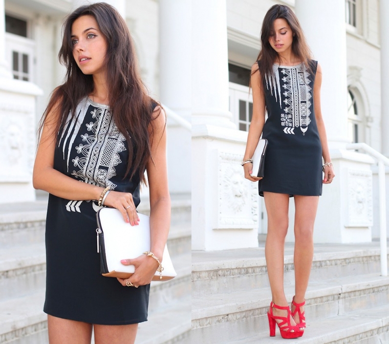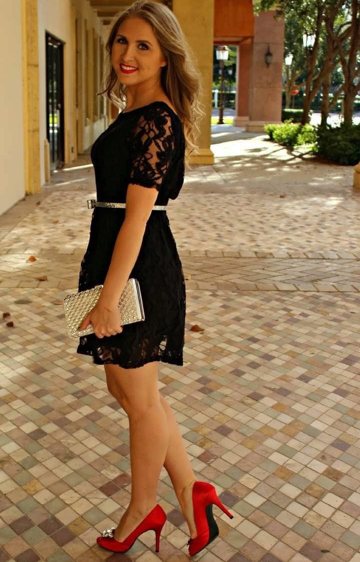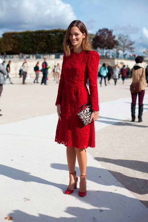 - The perfect combination for the evening is red shoes with a classic black or white dress. Also, the dress with lace trim fits to the shoes.