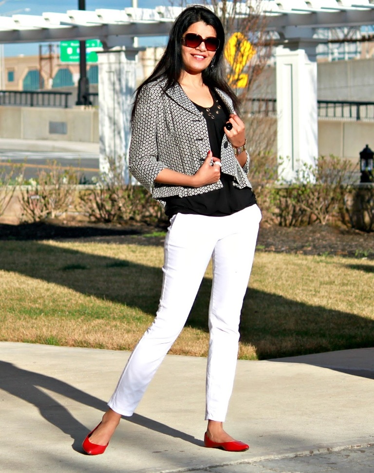 Red ballet flats and thick-heeled shoes are combined with skinny pants, jeans, and leggings.