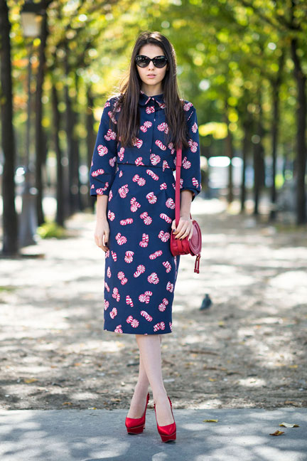 Red court shoes are combined with dresses of classic cut and skirts with a yoke of neutral colors.