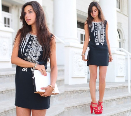 - White, black or white-black dress with a black bag or clutch. A little black dress, bequeathed by Coco Chanel, will work well. To this image, you can add any accessory in white - watches, strap, scarf, gloves and so on;