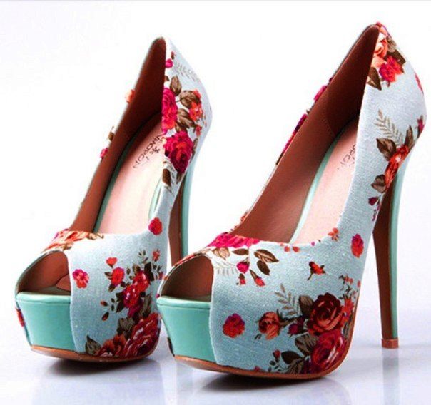 Popular products with a floral print (heel and sole with solid colors). Shoes with imitation under the skin of reptiles in green-brown tones look originally.