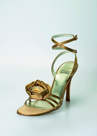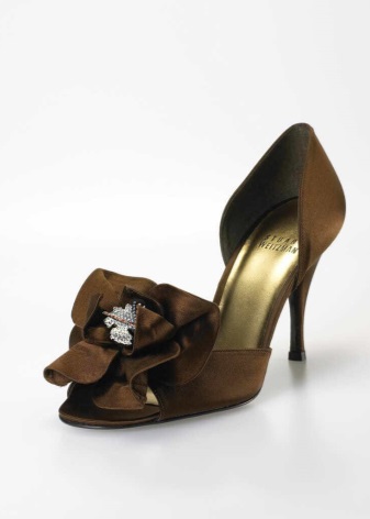 Shoes made of a dense bronze satin satin are presented in the form of sandals on a thin heel of medium height, with thin straps and a large flower, in the center of which adorn large crystals, which used to be part of the earrings of Merlin Monroe.