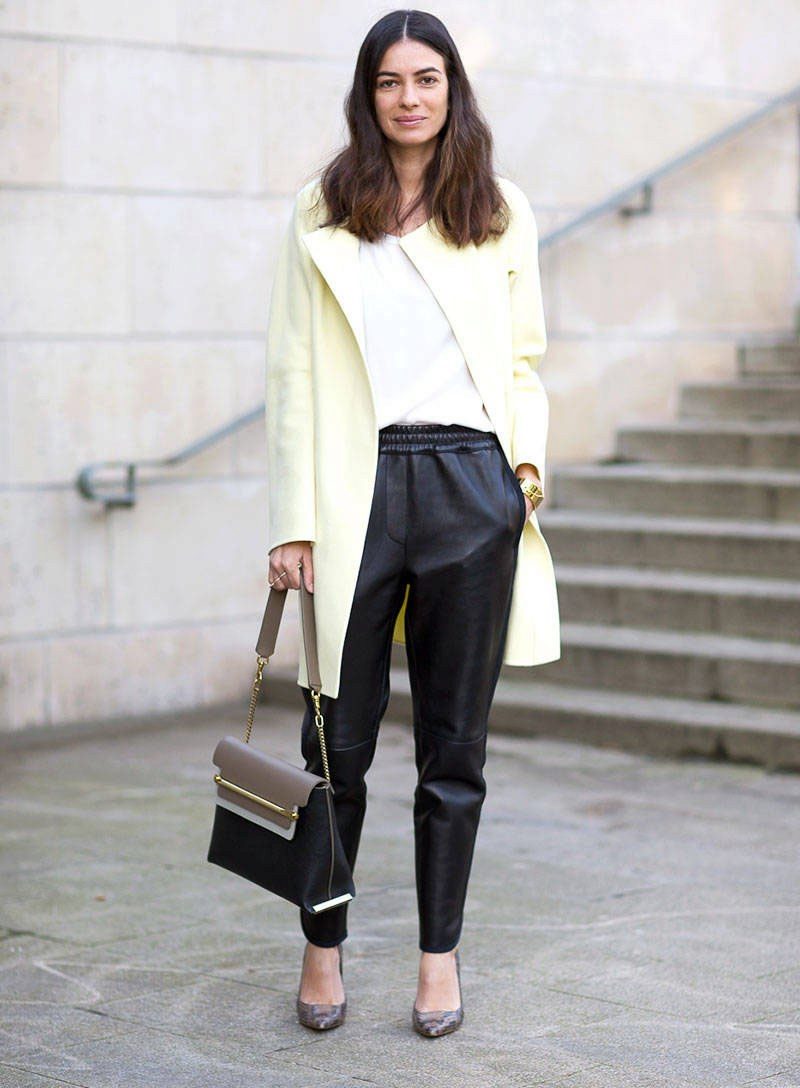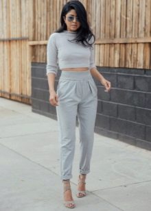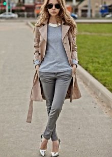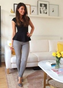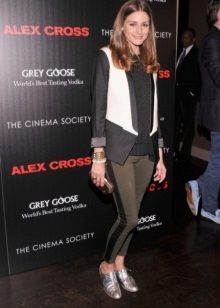 With gray lacquered boats, variations on the theme of a bright image are countless. In this case, it is proposed to wear with black pants with elastic skin. Immediately, a bright, uncommon charismatic image is set up, which can be complemented with a loose white top and a lightweight unlined coat. In the afternoon, in such a comfortable outfit, you can go to a business meeting, and in the evening you can supplement with picturesque accessories and go to a fun party.