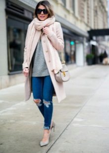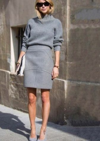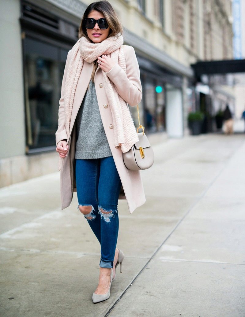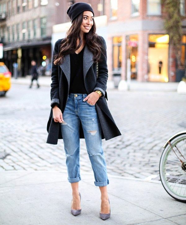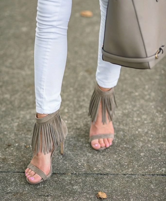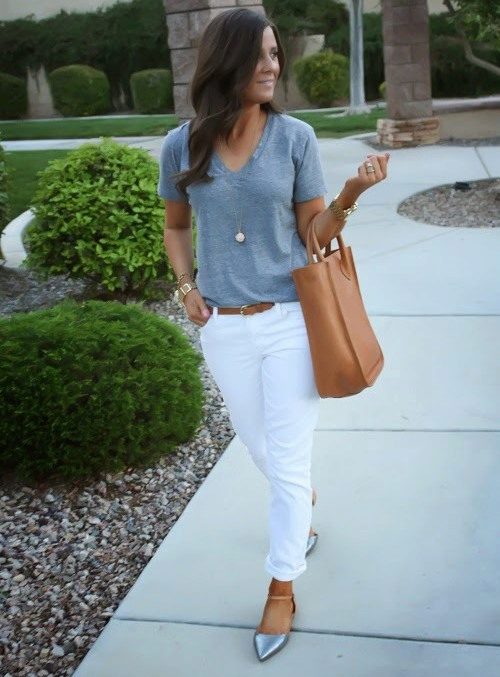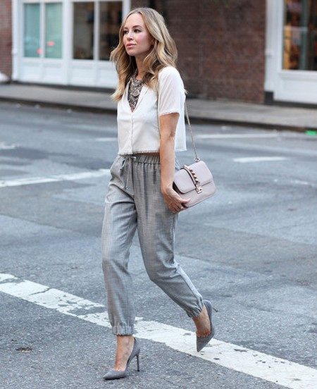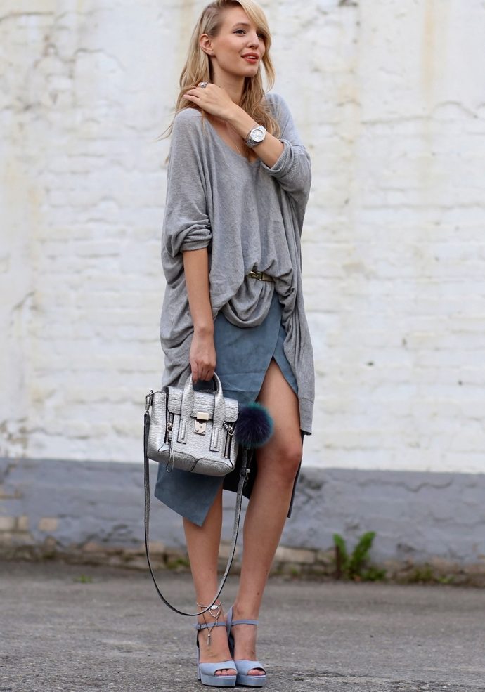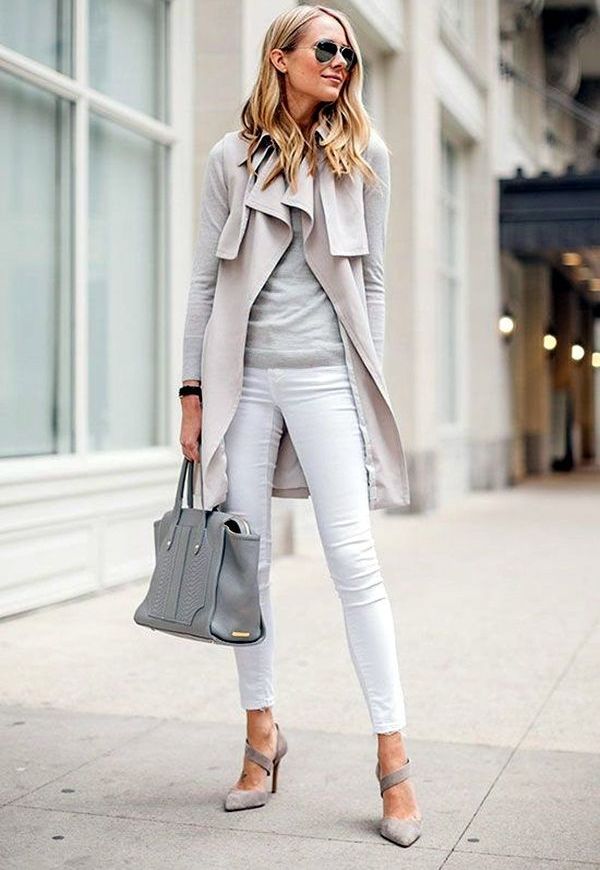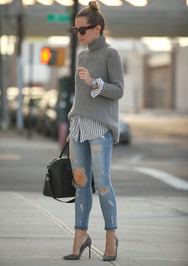 Gray suede high-heel pumps are a perfect match for skinny jeans. This ideal union can be complemented infinitely and in a variety of ways. For a small business trip, you can add a gray slim jumper with a throat in combination with a cotton shirt in a gray longitudinal strip. It turns out soft, but effective neat image. The bag does not have to be the same as the shoe The black color in the accessories will be optimal and will add a bit of elegance to the image. If desired, if the journey is hot, the sweater can be removed. Jeans, a shirt and gray pumps create a light fresh look, which is very important if you are on a long journey.