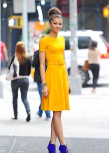 For holiday attire, it is better to choose lacquered pointed-heeled stiletto shoes or high-heeled shoes and a platform. Long and short dresses of yellow, green, blue, white, mint and black color harmoniously look with black and blue models of shoes.