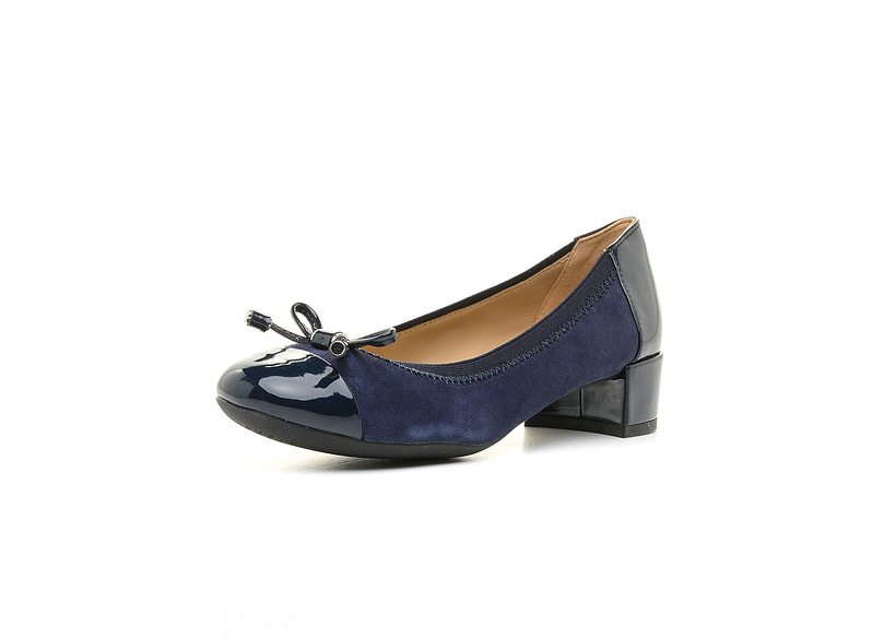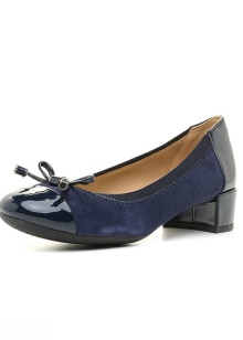 Italian brand Geox offers a choice of fashionable women stylish blue-black shoes in a simple business style. Feminine and very comfortable low-heeled pumps are very popular. Such models are made of blue suede with a lacquered black toe, heel and heel. Some items are decorated with a small leather bow around the nose.