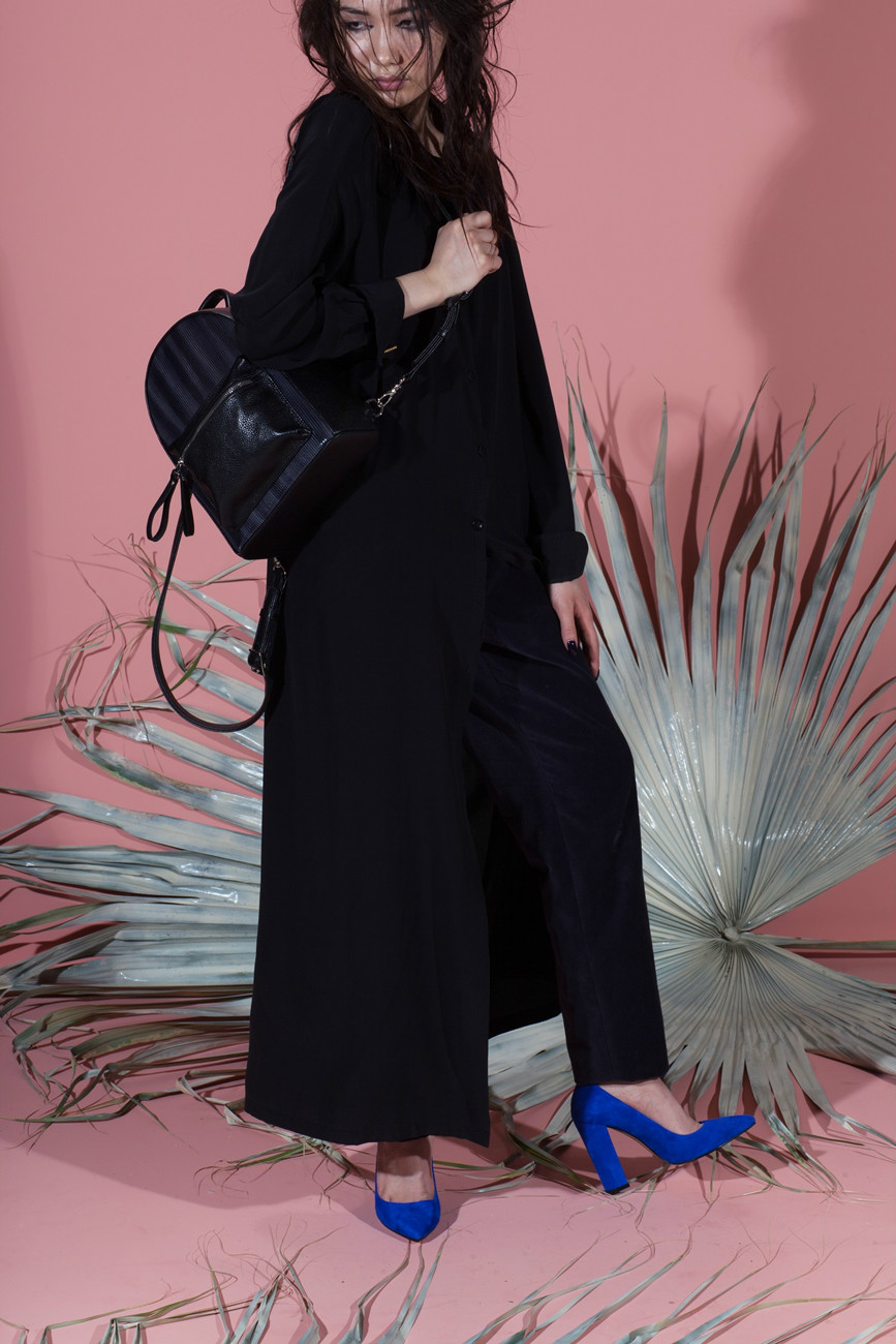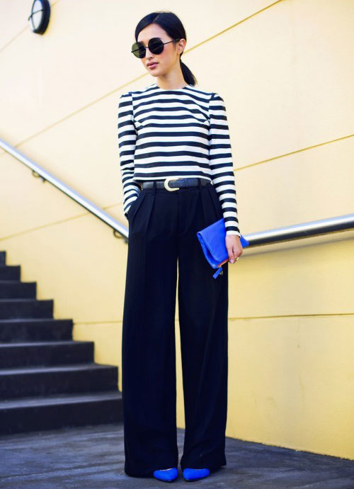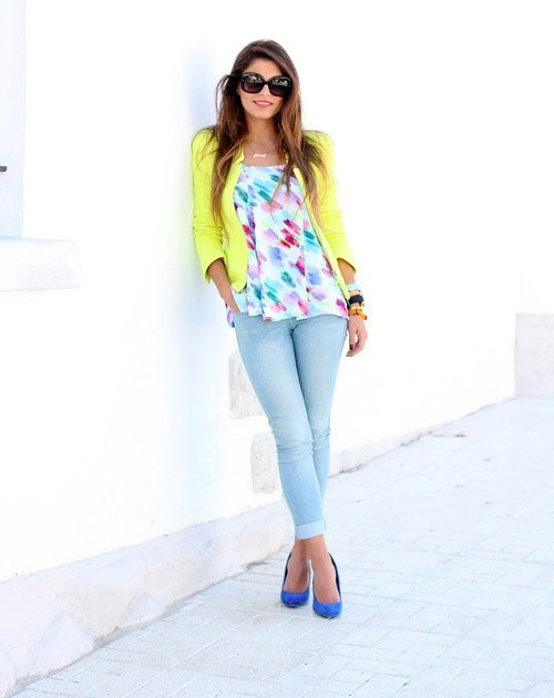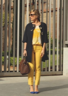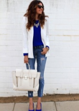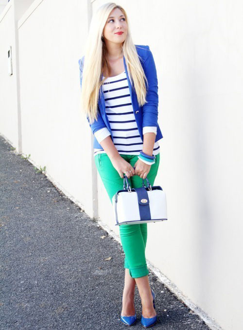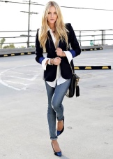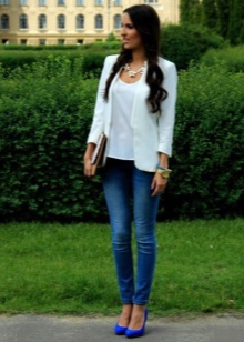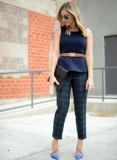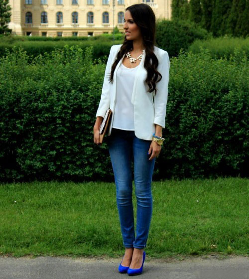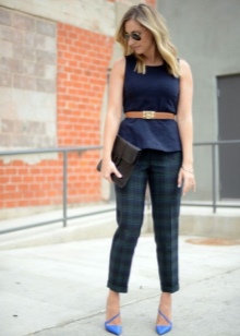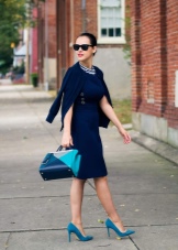 Blue shoes with high and medium heels look very stylish in combination with business trouser suits. Deep color shoes perfectly harmonize with strict shirts and blouses made of gliding fabrics, complemented by business jackets. Skinny pants in tandem with blue pointed-toe shoes with a medium or high heel will emphasize the harmony of the legs and visually stretch the figure.