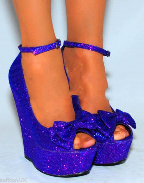 Bright blue platform shoes complete with details such as: