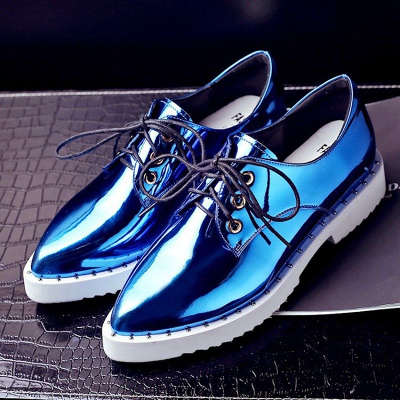 Blue shoes on a platform made of matte leather look quite strictly and concisely. In this shoe you can go to work or a normal walk. Often, matte models are complemented by leather straps of classic colors on the rise (like Mary Jane). In turn, patent leather shoes on the platform look more festive and sexy. The attractive shine of high-quality leather in combination with a properly chosen outfit will surely attract the attention of others.