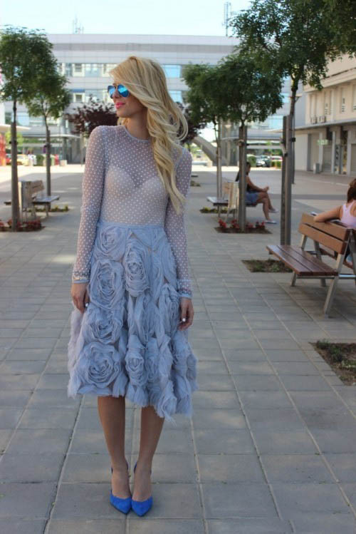 Blue platform shoes fit perfectly in a chic and feminine evening dress. To create a bright and dazzling image you can combine:
