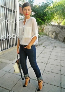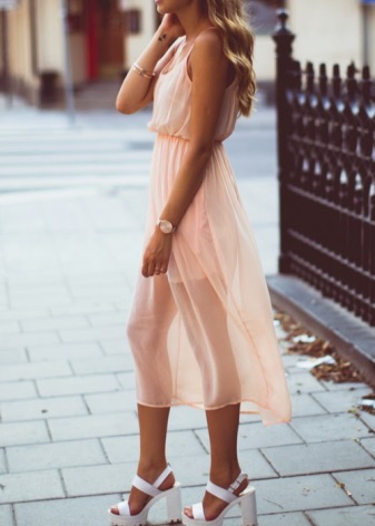 Models with wide heels are perfect for creating a stylish everyday look. Such shoes are well combined with dresses and skirts from chiffon, shirts and tunics of direct cut from light cotton, jeans clothes. The same shoes will effectively complement the image of a business woman. The snow-white blouse of a classic cut and a black skirt-case perfectly fit sandals with high thick heels, made in a classic color or bright, saturated, for example, red or blue.