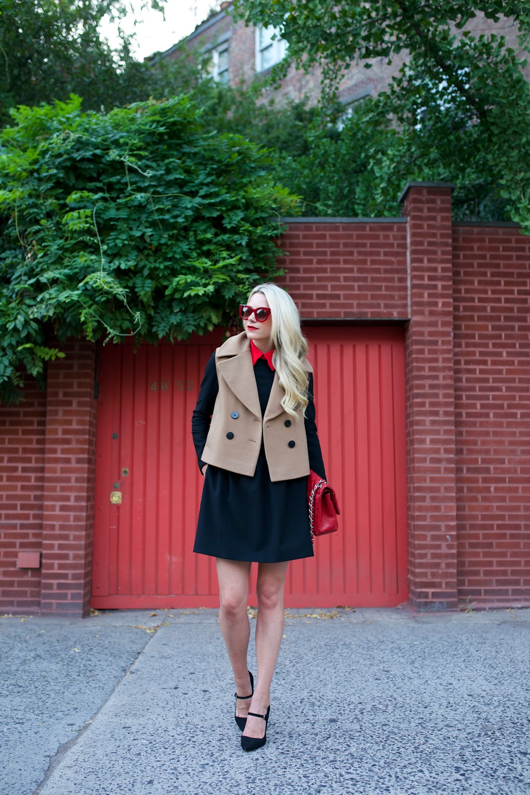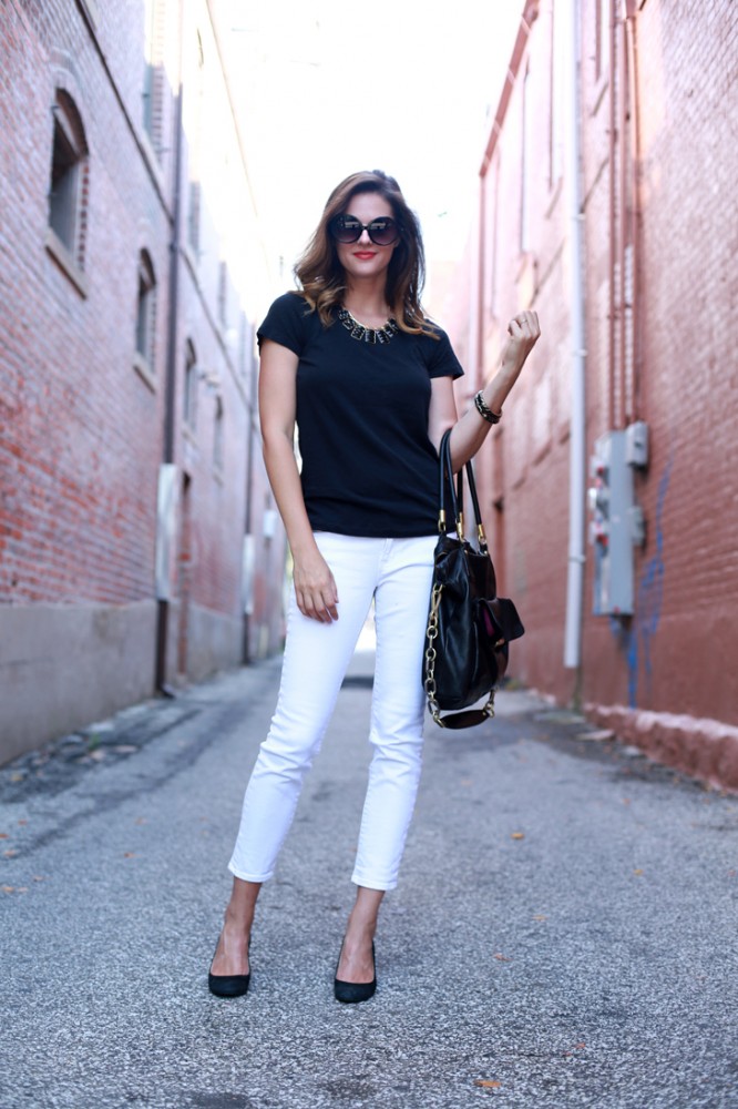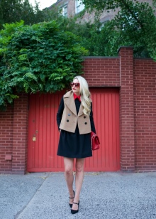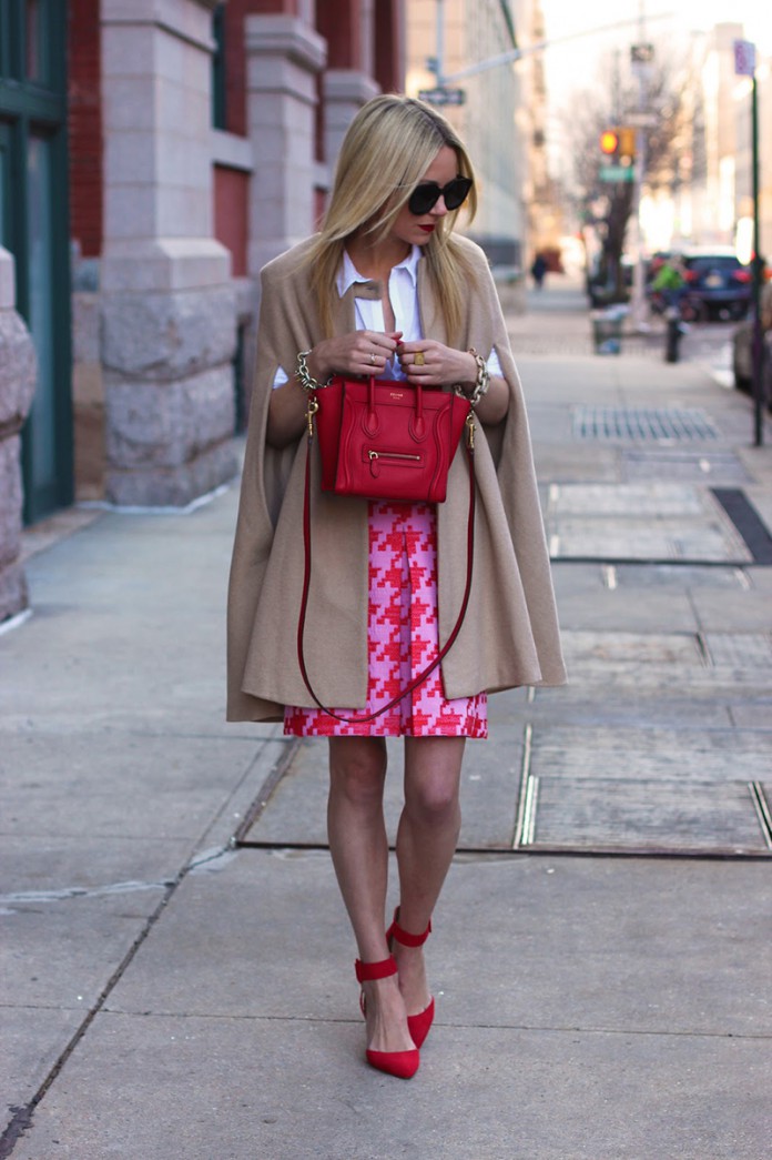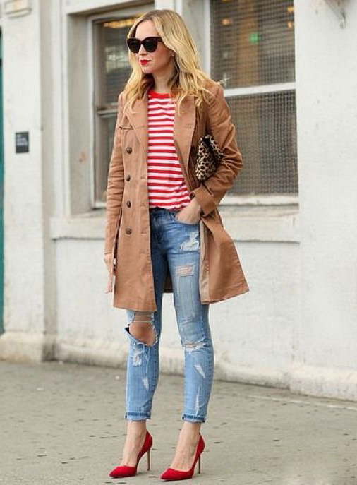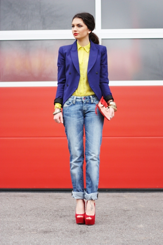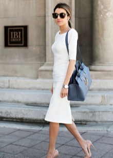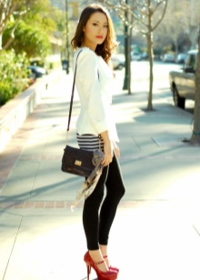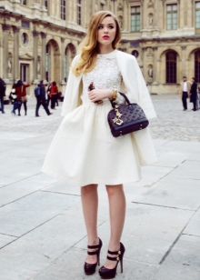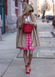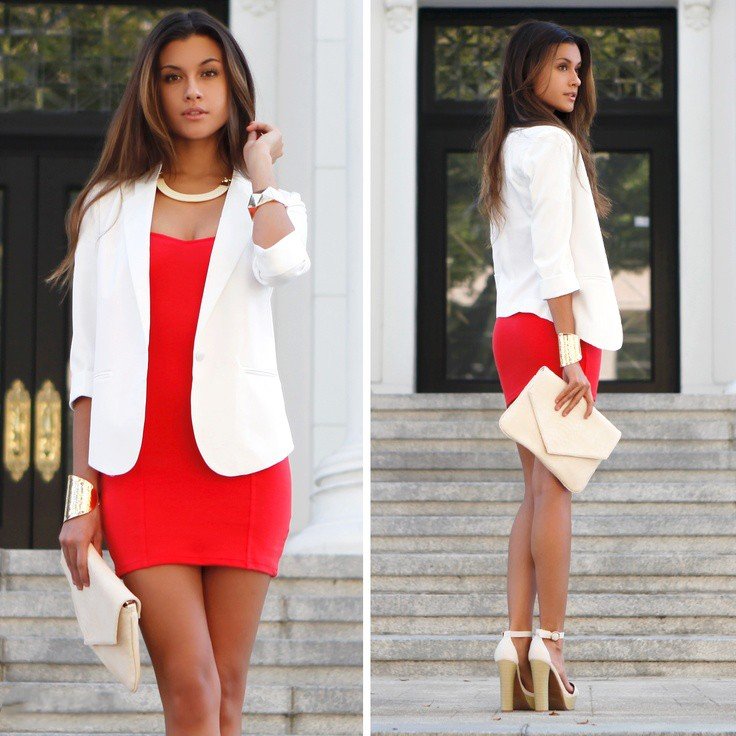 - Sexy and at the same time simple image: a red tight mini-dress is complemented by a snow-white jacket with a 3/4 sleeve and white shoes with a high thick heel and ankle strap. As accessories fit large golden jewelry.